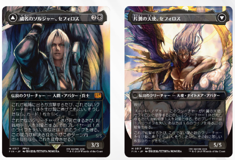 但從最終呈現效果來看,許多卡牌設計完成了這個困難的任務,在保留了人物特點的同時還極具創意。像是《最終幻想7》中的著名反派薩菲羅斯,就採用了雙面牌的設計,正面是“傳奇神羅戰士”,可以犧牲己方生物汲取對手生命,滿足條件後翻轉為終極形態“片翼天使”,可以肆意犧牲己方生物換取手牌。