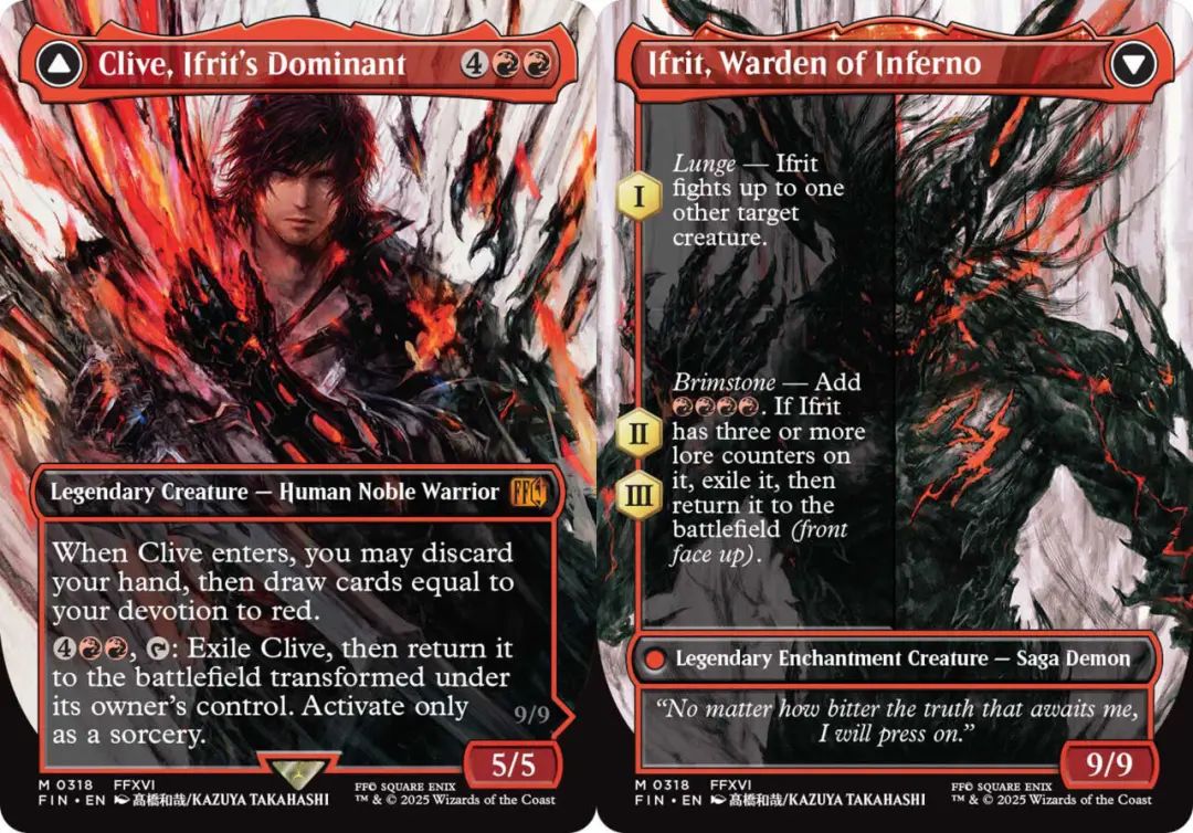 這次聯動裏,這樣的雙面卡牌挺多,像是《最終幻想16》中的克萊夫,只要支付足夠法術力,就可以變身伊芙利特,獲得強大的能力,身材也從5攻5防變成9攻9防,而等3回合一過,伊芙利特又會變回克萊夫本人。這一設計還原了《最終幻想16》中“召喚獸寄宿在人類身體”的設定,也把遊戲中克萊夫一次次痛苦掙扎喚醒伊芙利特的劇情自然而然地融進了玩法中,相當巧妙。