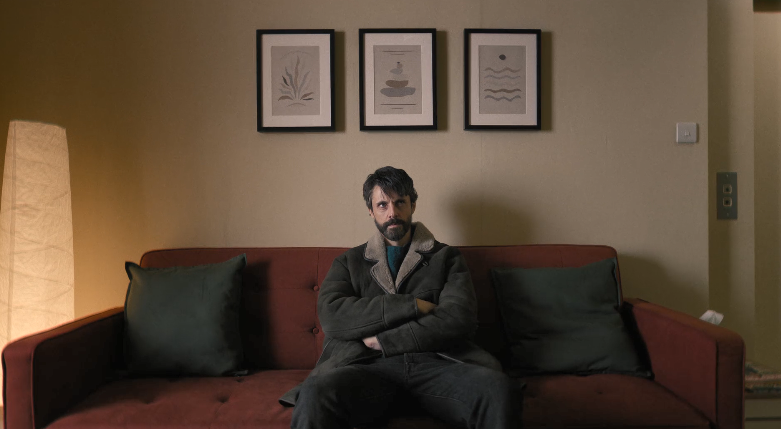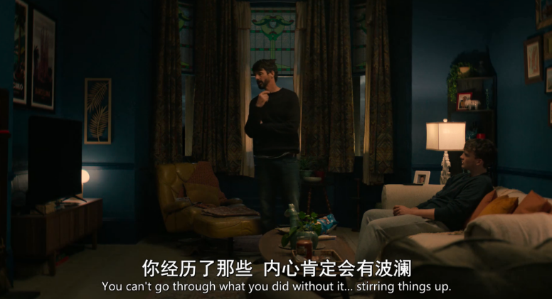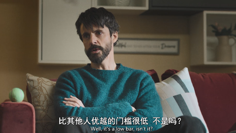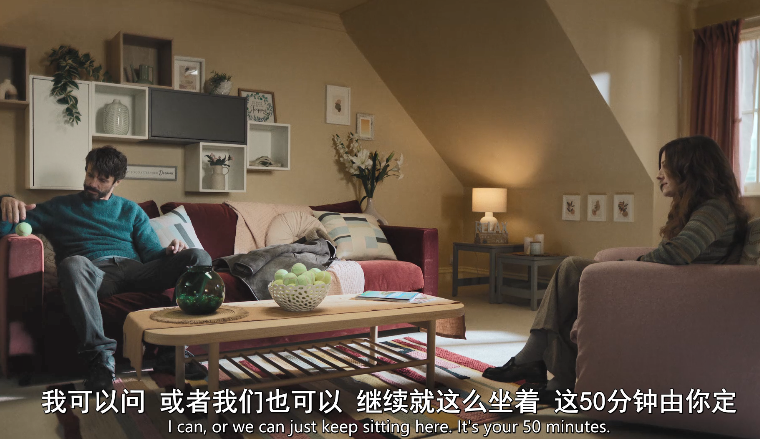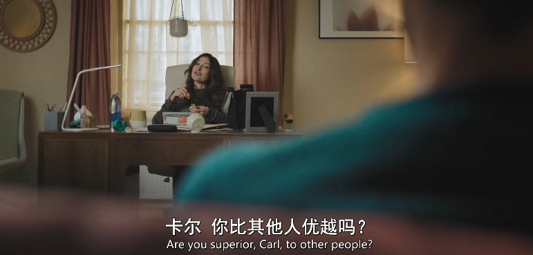 比如這一幕,卡爾坐在心理醫生的諮詢室裏,他抱着手臂坐在紅色的沙發上,難掩醫生遲到時的怒氣。