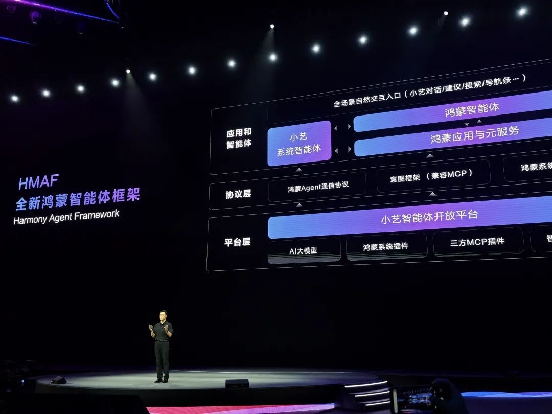 為了讓這個構想落地,**鴻蒙智能體框架 HMAF(Harmony Agent Framework)**分為應用和智能體層、協議層和平台層,目的只有一個:讓開發者能輕鬆、高效地為自己的應用「注入靈魂」,打造出強大的智能體。