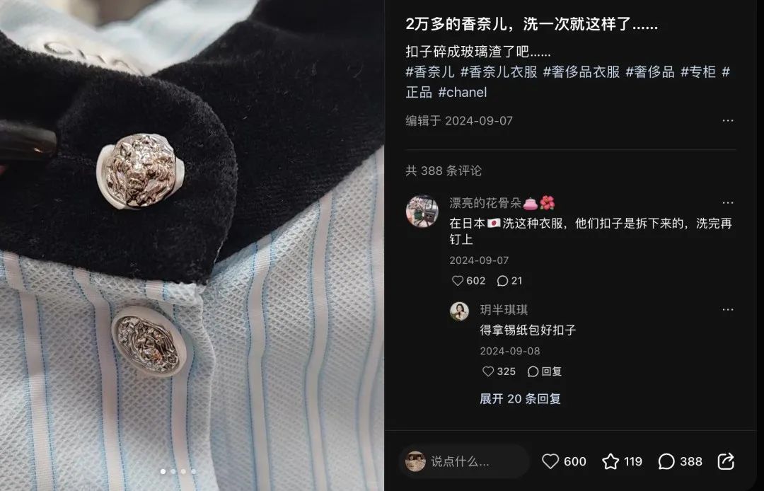 香奈兒的衣服,洗一次後釦子就碎成了渣渣。有評論説,這種衣服是不能直接洗的,要把釦子拆下來,洗完再重新釘上;