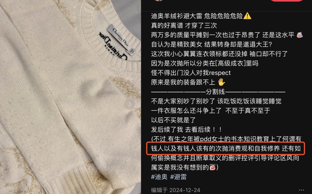 然而在沉迷大牌的人看來,這些商品質量問題卻成了它們的徽章,如果承擔不了損失,或者不會“保養”商品,從一開始就不應該選擇奢侈品來進行消費。