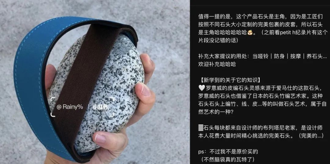 就連頂級奢侈品牌愛馬仕也不能免俗。有網友曬出過自己擁有的最奇葩的愛馬仕產品是一塊愛馬仕石頭,每塊石頭都是從設計師老家精心挑選的。