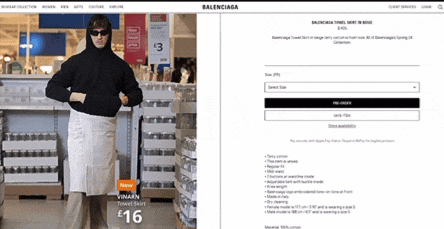 緊接着,巴黎世家被宜家擺了一道。在巴黎世家推出了一款1000美金的浴巾裙後,宜家火速跟進了這個熱點,迅速在社交平台發了幾乎是同款造型的浴巾,唯一的不同是,宜家海報上的這條浴巾,只需要10美金。