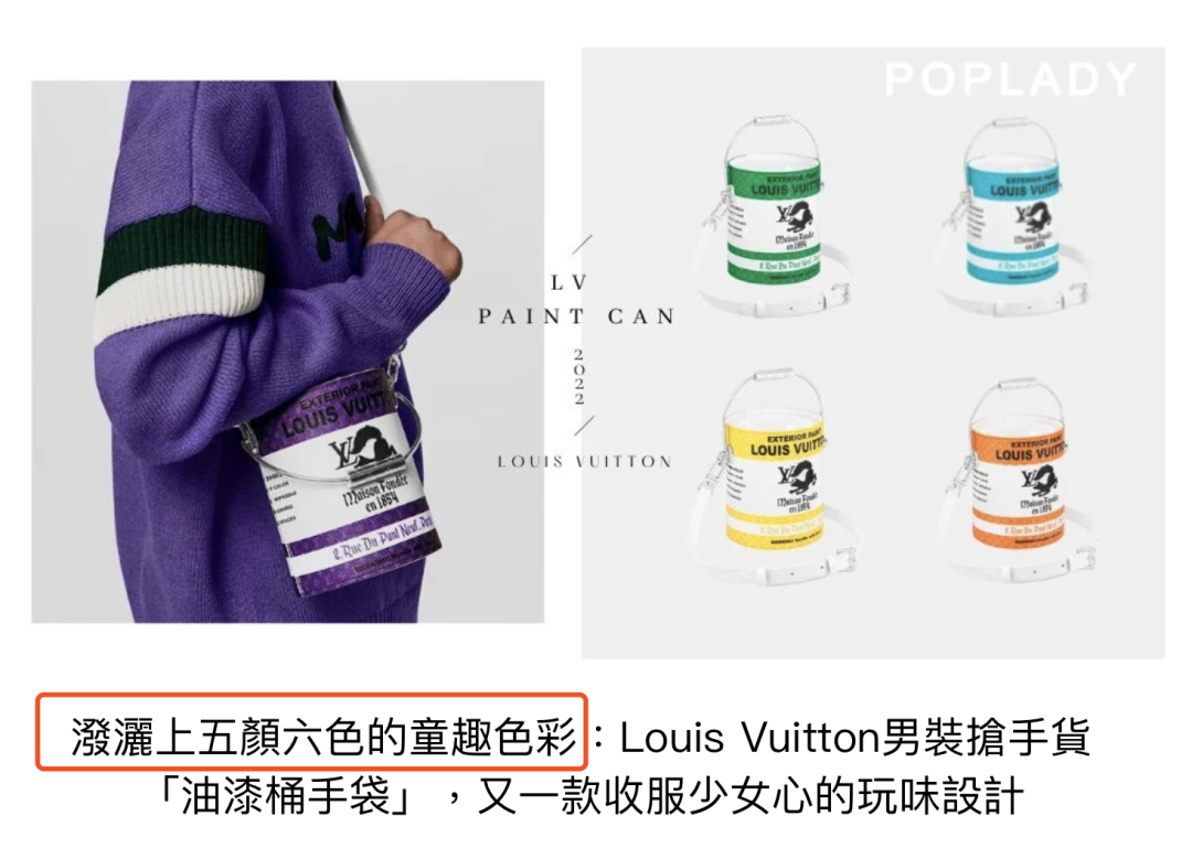 2022年LV 還推出過一款油漆桶包包,它外形和油漆桶一模一樣,價格卻翻了不知多少倍,要16000元才能將其收入囊中;這款設計的理念是“童趣”,不同的顏色能為人帶來不同的好心情。