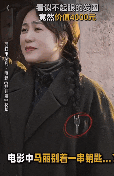 這之中堪稱完美聯動的是電影《抓娃娃》裏馬麗戴的鑰匙髮圈。在電影中沈騰、馬麗飾演的富豪一家為了孩子的教育假裝窮人。馬麗戴的這個髮圈,神似洗浴中心儲物櫃的鑰匙圈,確實一點看不出貴來。