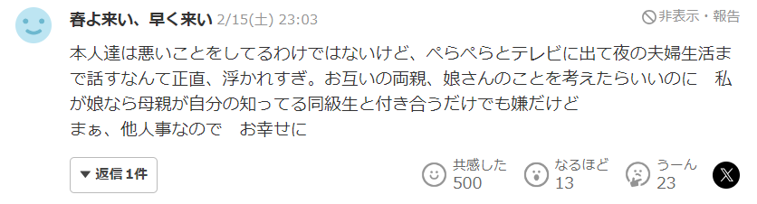 他們並沒有做錯什麼,但是在電視上滔滔不絕地談論甚至連晚上的夫妻生活都提及,這確實顯得有些過於輕浮了。真希望他們能夠考慮一下雙方的父母以及女兒的感受。如果我是那個女兒,我會對母親與自己認識的同學交往感到不舒服。