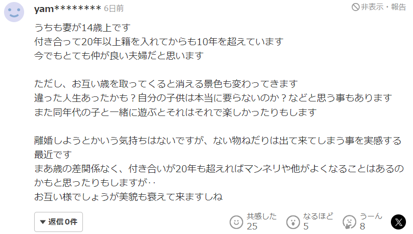 我妻子也比我大14歲。我們戀愛超過20年,婚後也已經一起走過了超過10年的時光,現在依然是一對非常和睦的夫婦。