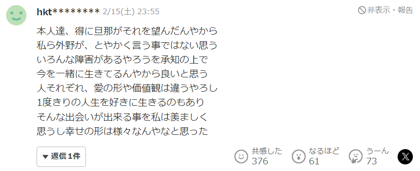 他們兩個人,尤其是丈夫希望如此的話,我們這些外人不應該多加批評或評論。他們清楚地知道可能會遇到各種障礙,但仍然選擇共同生活在這個當下,這本身就是一件好事。每個人的愛情形式和價值觀都是不同的,按照自己的方式度過僅有一次的人生也是一種選擇。