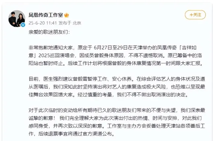 就在今天鳳凰傳奇發佈公告,以成員曾毅身體健康出現問題為由,取消了這個月底天津站,以及下個月洛陽站演唱會的安排,並且都已經進入退票流程。