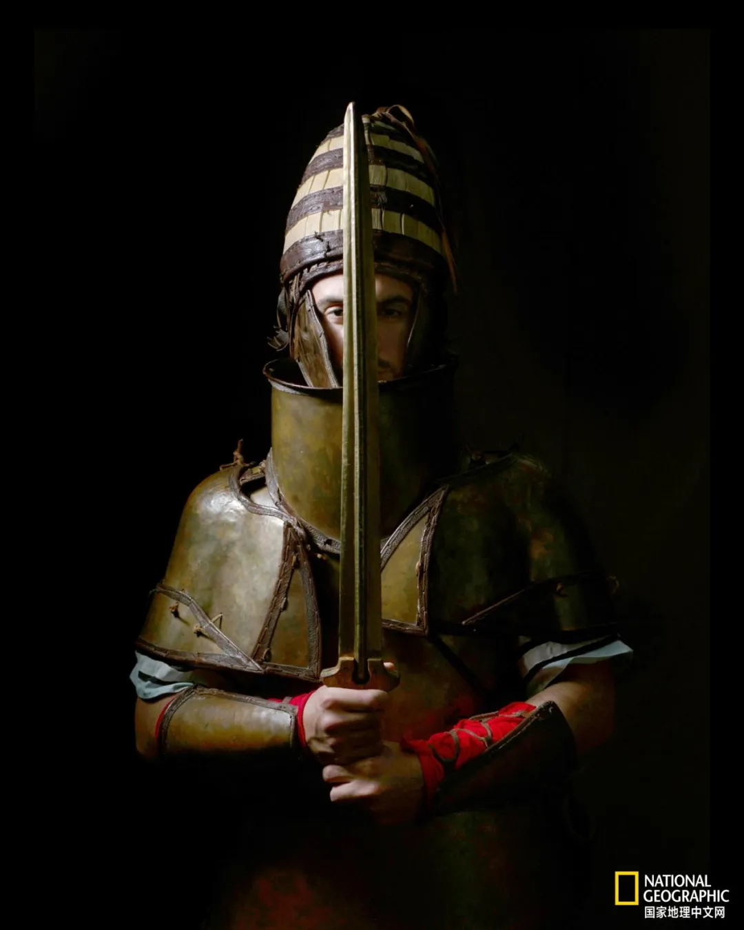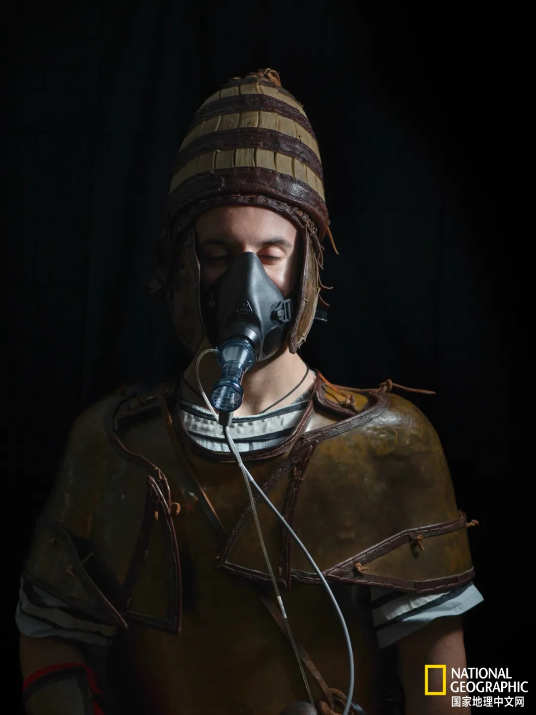 一名身着古代盔甲複製品的現代志願者暫停戰鬥,佩戴用於監測能量消耗的氣體分析儀。未參與該研究的考古學家巴里·莫洛伊(Barry Molloy)表示:“這類盔甲套裝本會徹底改變戰場格局。”