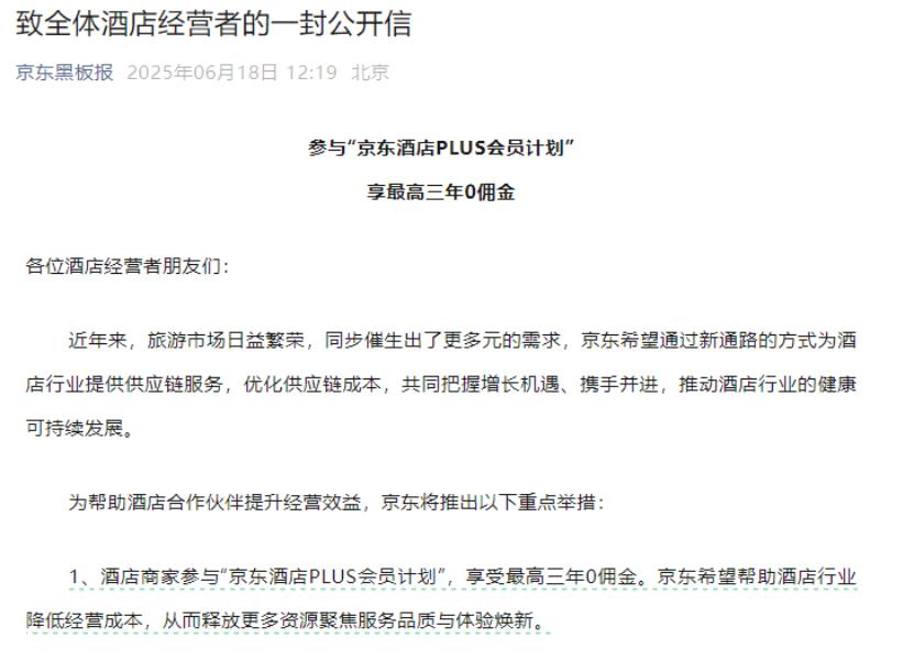 近日,劉強東又雙叒叕登上熱搜。6月18日,“京東黑板報”微信公眾號發佈《致全體酒店經營者的一封公開信》,宣佈酒店商家參與“京東酒店PLUS會員計劃”,可享最高三年0佣金。