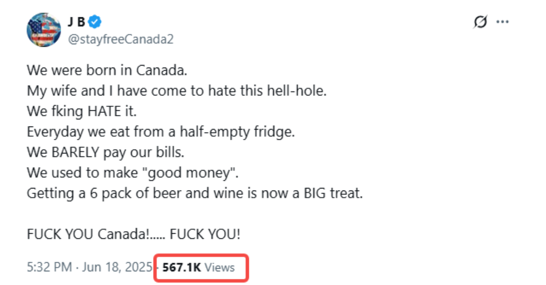 發帖者憤怒寫道:“我和我的妻子都出生在加拿大,但我們現在越來越痛恨這個鬼地方了。我們真是恨透了!每天只能從半空的冰箱裏找吃的。幾乎付不起賬單。我們以前收入“還不錯”,但現在連買6瓶啤酒和葡萄酒都成了一種奢侈享受。去你的,加拿大!……去你的!”