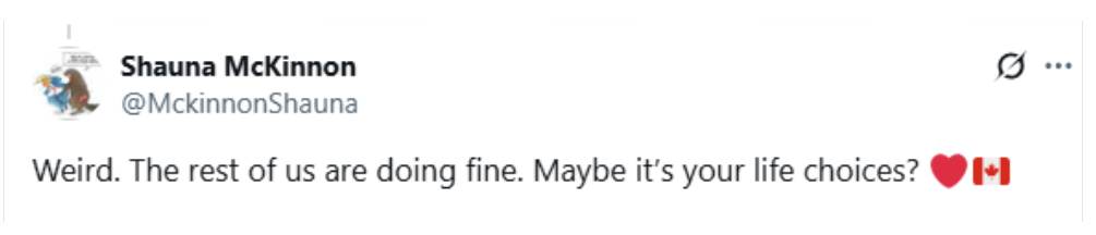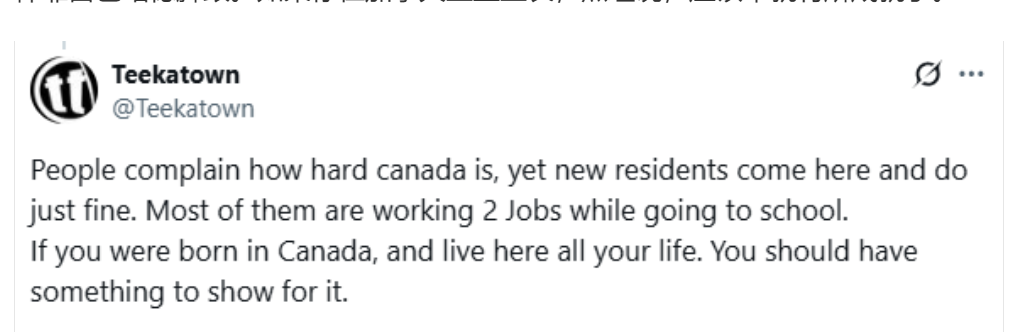 “當人們把自己的人生失敗歸咎於別人(這次是他們的國家)時,總覺得有點悲哀。如果你連在像加拿大這樣的國家都混不下去,那你在哪兒都混不下去。”