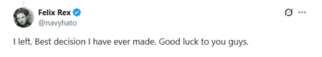 “我已經離開了。那是我做過最正確的決定。祝你們好運。”