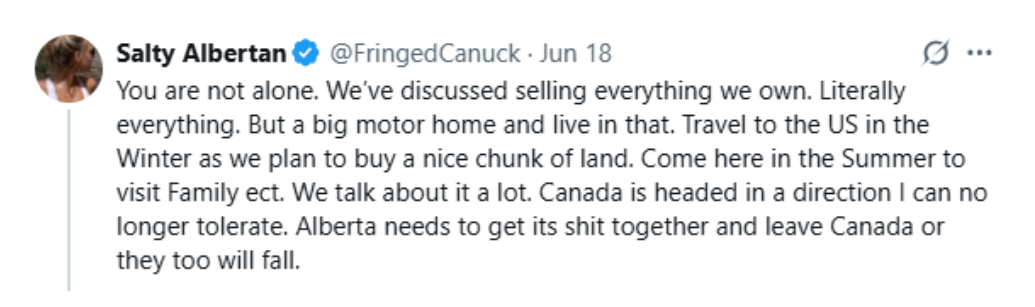“你並不孤單。我們家也討論過賣掉所有家當。認真的,所有東西,除了一輛大房車。我們打算住在房車裏,冬天就去美國,夏天再回加拿大看看家人什麼的。加拿大正在走向一個我再也無法忍受的方向。阿爾伯塔省要是還不清醒點脱離加拿大,遲早也會完蛋。”