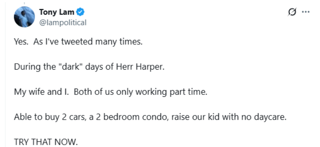 “在哈珀執政時期,我和我妻子當時都只是做兼職,卻能買兩輛車、一套兩居室公寓,還能在沒有托兒服務的情況下養孩子。現在你再試試看。”