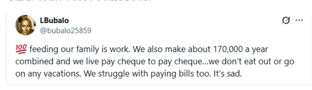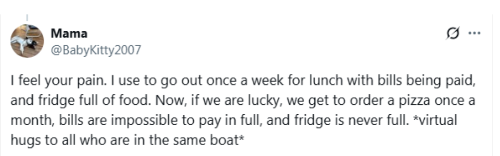 “我懂。以前每週還能出去吃頓午餐,賬單都能按時付清,冰箱裏也總是滿的。現在呢,如果運氣好,一個月能點一次披薩都算奢侈,賬單根本交不全,冰箱永遠是半空的。給所有正在經歷這些的人一個隔空擁抱。”