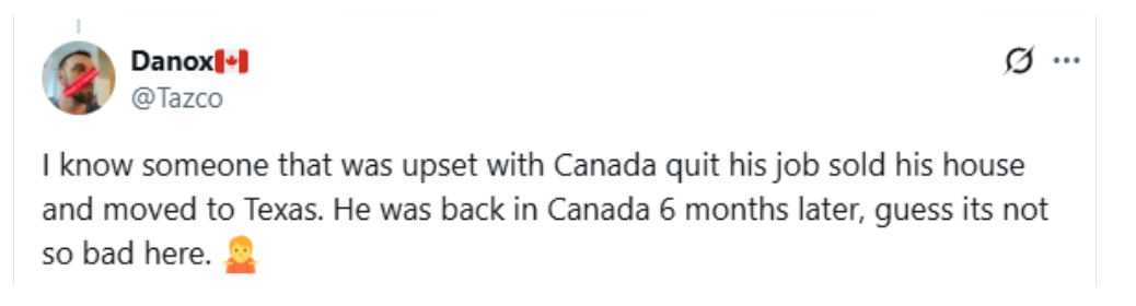 “我認識一個人,之前對加拿大很不滿,辭了工作,賣了房子,搬去了得克薩斯。結果六個月後他又回來了,看來加拿大也沒那麼糟糕。”