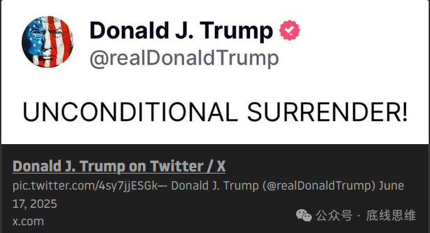 特朗普聞後,飛機還沒落地就回嗆馬克龍,説這位仁兄人是不錯,就是經常拎不清,喜歡瞎咧咧,而且幾乎沒有説對的時候。他在回答隨行記者問題時説:“我要做的是徹底結束伊朗這件事。” 之後還發帖,公開要求伊朗“無條件投降!”