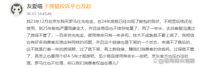 事實上,在召回之前,也有不少消費者反映質量問題,6月1日,一位消費者投訴:“23年12月在京東購買羅馬仕充電寶,在24年底就已經出現了鼓包的現狀,不明顯後續還在使用,到25年鼓包嚴重現象變大,並且該商品也不續存電量了,用了一年半,去找客服溝通過了質保不管了,一百多塊充電寶,使用壽命只有一年多嗎,技術不成熟就不要上架了,我相信也有好多消費者反饋這種同樣的問題,並且這個鏈接也是下架的一個狀態,申請不了售後的,這不就是打着一年的質保期,過了就下架,再上新鏈接,賺我們消費者的快錢嗎,過保就不管了,再怎麼也要用個好4-5年才報廢吧,至少商品使用壽命長一些吧,京東官方也沒辦法處理,羅馬仕也不處理,所以我們消費者權益在哪兒?”