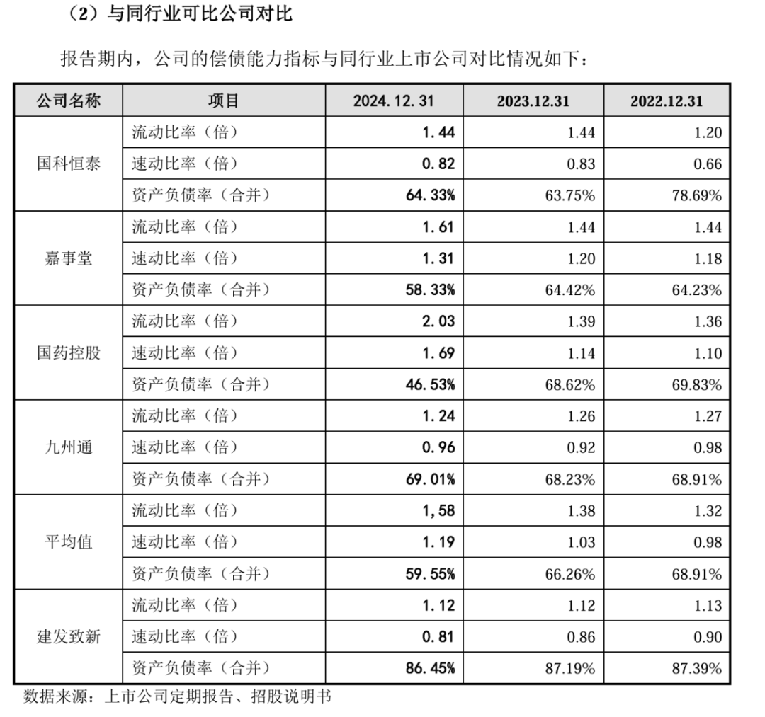 但建發致新的資金優勢並不明顯,公司負債率較高,短期償債能力也明顯弱於同行均值。