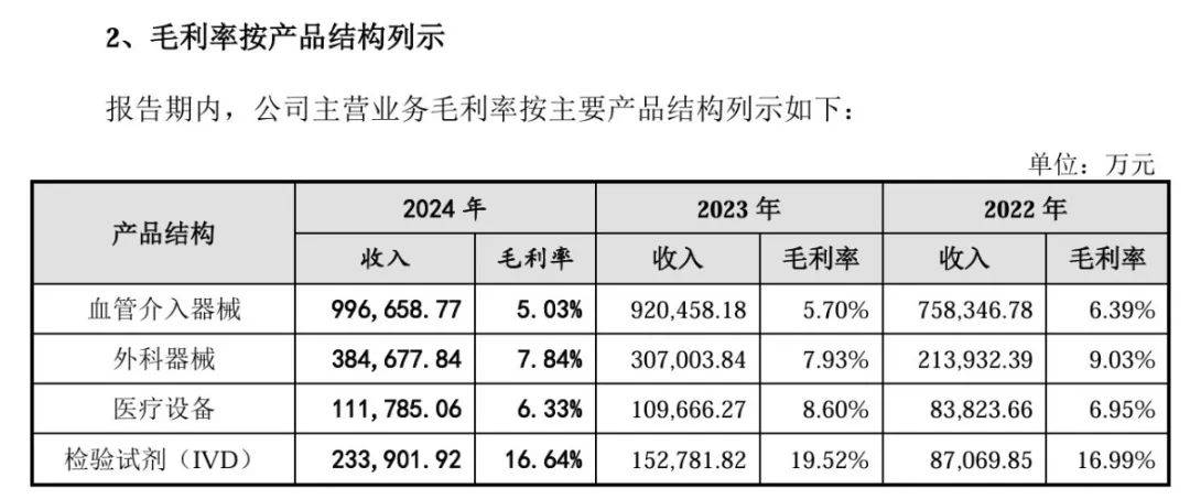但近年來,公司的血管介入器械的毛利率呈逐年下滑趨勢,由2022年的6.39%下滑至2024年的5.03%。