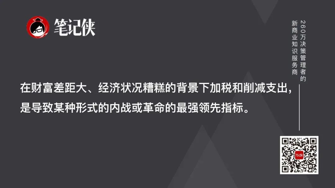 歷史表明,在財富差距大、經濟狀況糟糕的背景下加税和削減支出,是導致某種形式的內戰或革命的最強領先指標。