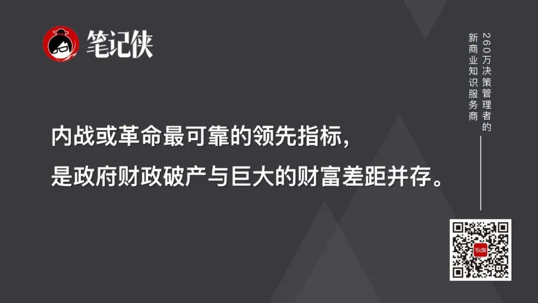 通過研究50多次內戰和革命,可以清晰地看出,內戰或革命最可靠的領先指標是政府財政破產與巨大的財富差距並存。