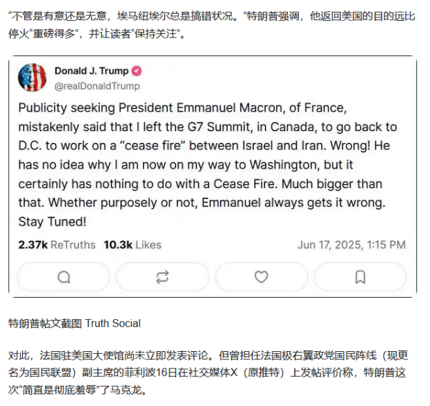 然而特朗普毫不留情地批評“一心想出名的法國總統馬克龍誤以為我離開加拿大的七國集團峯會,是為了回華盛頓推動以色列和伊朗之間的‘停火’。錯了!”這種直接“打臉”的行為顯然展示出特朗普對馬克龍小丑行為的不耐煩。