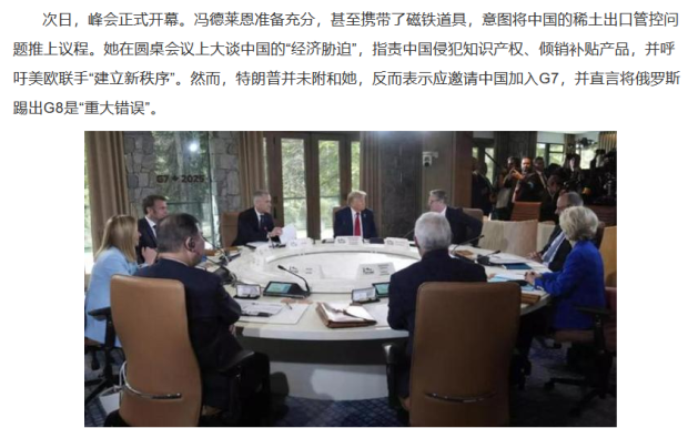 2025年6月17日,隨着特朗普意外宣佈他將提前返回華盛頓,G7的剩餘會議已經實際上演變為殘餘的G6。原本對與特朗普會面滿懷期待的烏克蘭總統澤連斯基也在短暫出席後提前回國。與此同時,鑑於特朗普政府的明確反對,G7也僅以加拿大總理發表“主席聲明”的方式發表對國際地緣政治局勢的簡單看法。