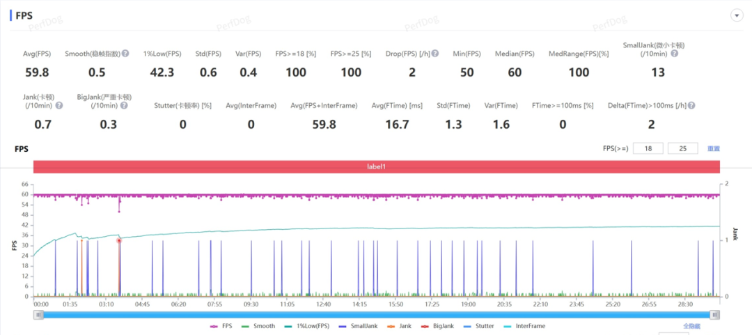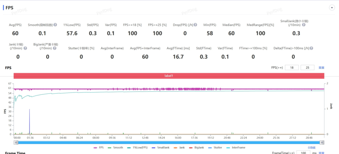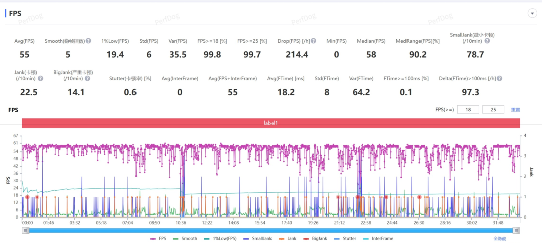 結果怎麼樣呢?我們在肉鴿模式進行半小時遊玩測試。由於這裏基本都是戰鬥場景,壓力還是很大的。實測半小時下來,平均幀有 55fps。由於肉鴿模式大概是10分鐘左右一局,每局之間會有讀圖的過程,所以 1%Low 幀就沒什麼參考性了。