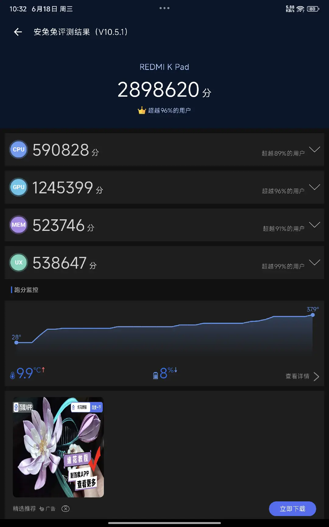 簡單跑個安兔兔,室温能跑到289萬分。妥妥的第一梯隊。