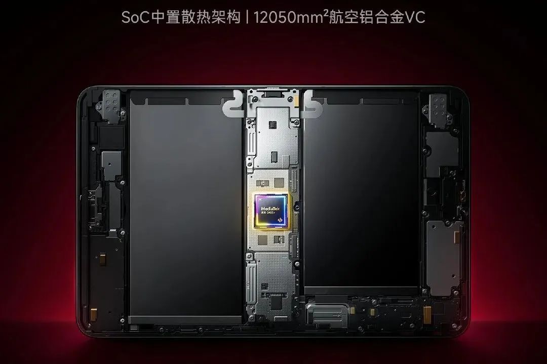 測了這麼多,有一説一天璣 9400+ 放在平板上,性能釋放確實要比在手機上強很多。而 REDMI K Pad 為了壓制住這顆處理器也下了很大功夫:SoC中置設計可以讓雙手握持時避開熱源,而 12050mm² 鋁合金液冷 VC則能夠達成10W穩定性能釋放。