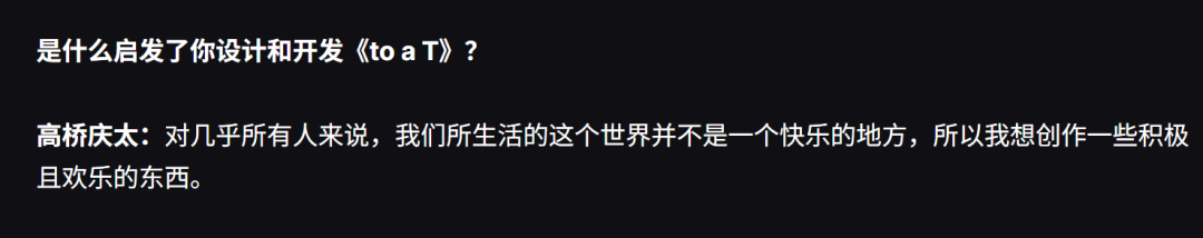 所以把《To a T》看作一個面向低齡兒童的遊戲,或許也沒什麼錯,那本就是高橋慶太一直以來想做的東西,只不過我們能看到的評價,更多來自成年人。