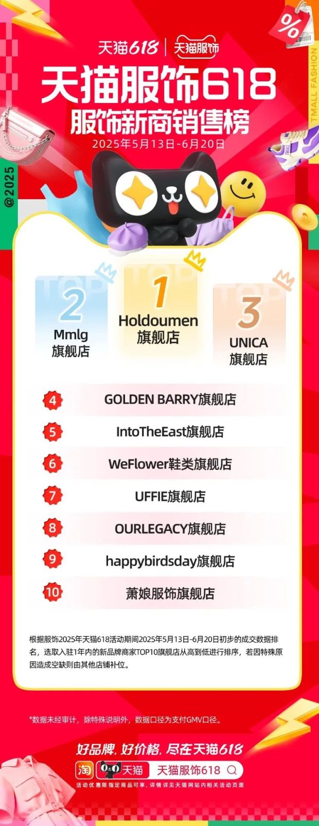其中,Holdoumen、Mmlg、UNICA、GOLDEN BARRY、IntoTheEast登上新商銷售榜前5。