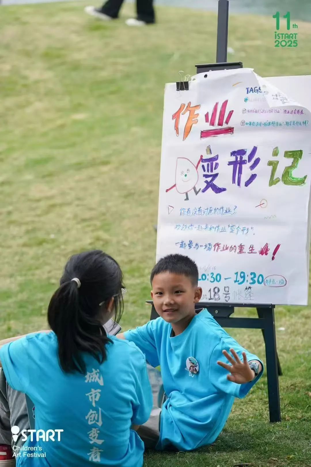 活動當天,我們很早就到達了現場。小恩像是充足了電量,一個人拉着一堆東西往前衝。更巧的是,她在青少年社區的新朋友竟然也在現場。她做了一個叫“作業變形記”的裝置,超酷!大家一起在現場撕作業,給作業寫墓誌銘。