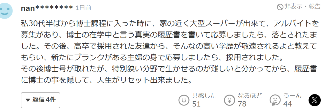 “我在三十多歲時進入博士課程讀書,那個時候,家附近開了一家大型超市,正好在招聘兼職。我如實填寫了“博士在讀”的履歷去應聘,結果被刷下來了。後來,被一位高中學歷被錄用的朋友告知:那種學歷太高了,反而會被敬而遠之。於是我改成寫成一個有空白履歷的主婦身份再次申請,這次順利被錄用了。