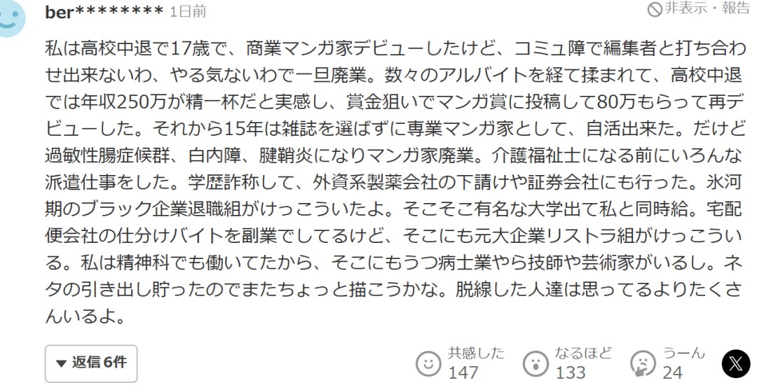 對齋藤的故事,日本網友也深有感悟。有的網友分享了自己和齋藤一樣過着脱線的人生經歷。