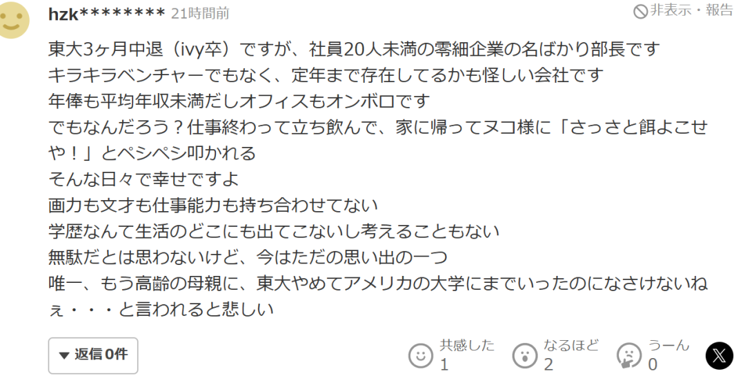“我是東大退學(只讀了3個月,Ivy League畢業),現在在一家員工不足20人的小型企業裏掛着部長的頭銜。既不是那種光鮮亮麗的創業公司,也説不準公司能不能撐到我退休。年薪也不到日本的平均水平,辦公室也是破破爛爛的。