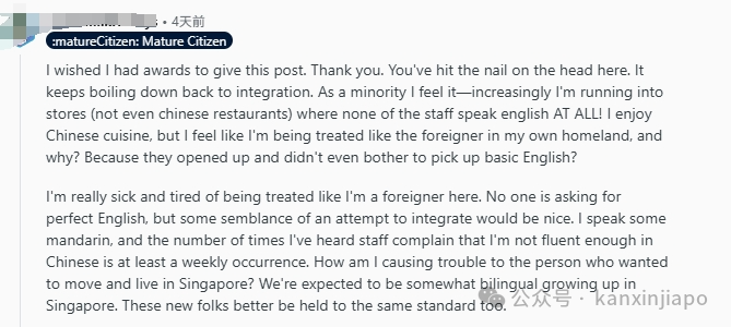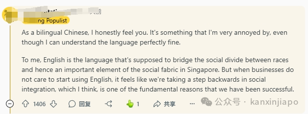 這位獲得最多贊(1406)的網友説,“作為一個雙語華人,我完全理解你的感受。雖然我精通華語,但這讓我非常惱火。對我來説,英語應該是彌合種族分歧的語言,是新加坡社會結構的重要組成部分。”