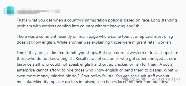 也有人將話題引向了政策,有些人認為應該立法強制使用雙語標識,也有人提到這本身就是新加坡移民政策的結果體現:即便是本地或者西式商店出於成本也會僱傭不能説英語的員工,小企業也負擔不起讓員工去上英語課的費用。