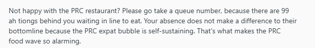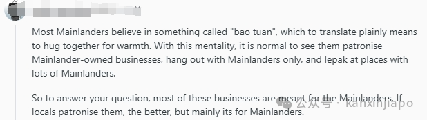 網友這一觀點獲得了類似的支持,有人認為中國人很會“抱團”,他們本身就是為那些説普通話的人服務的,如果新加坡本地人光顧,當然歡迎,但他們的目標顧客其實不是當地人。