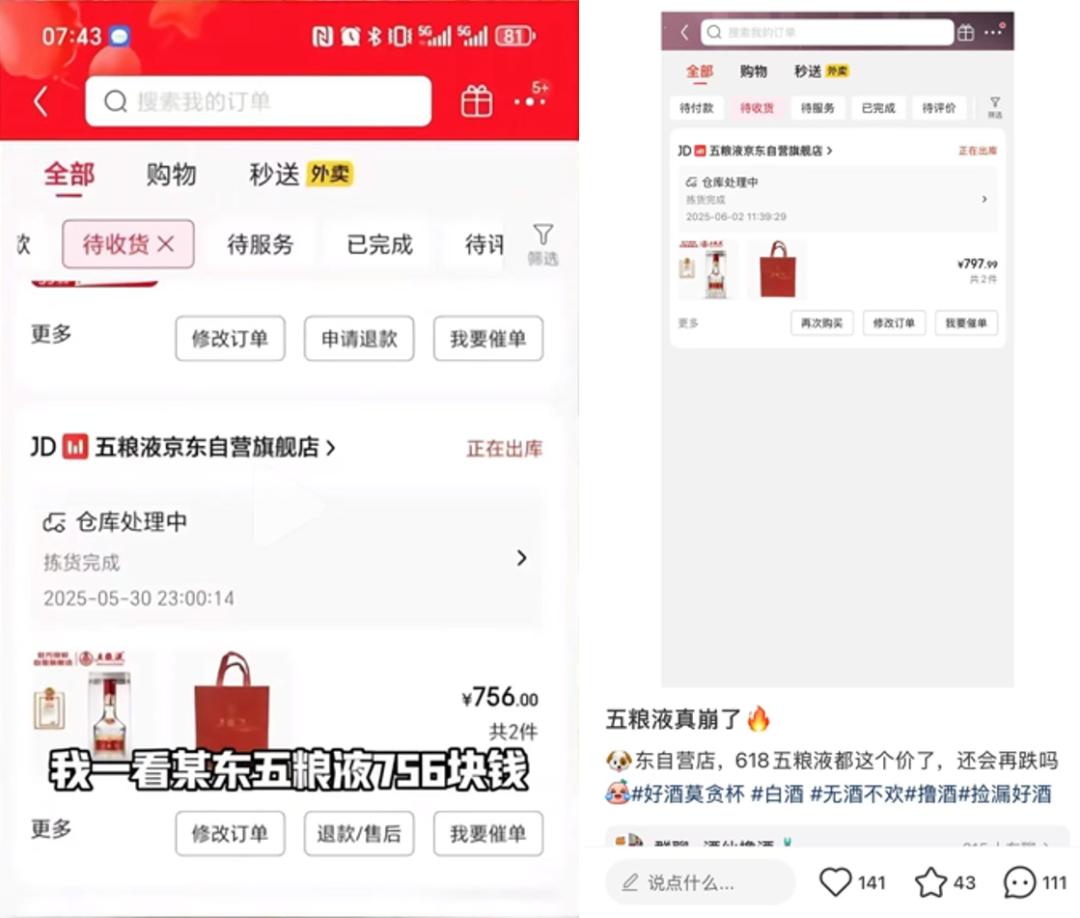 此外,在社交平台上,也有不少消費者,曬出了在五糧液京東自營旗艦店內買到的800元以下普五。