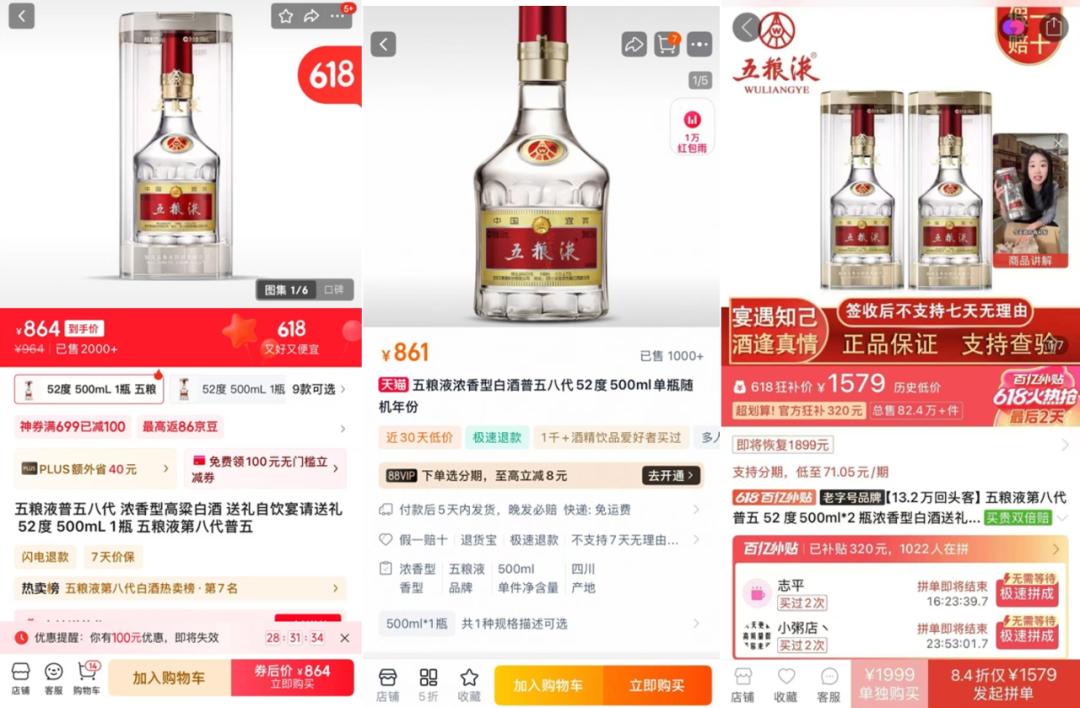 再看電商平台這邊,今年“618”期間,高端白酒價格戰依舊打得火熱,在拼多多、京東平台,各種優惠補貼下來,普五價格已壓到800元以內。