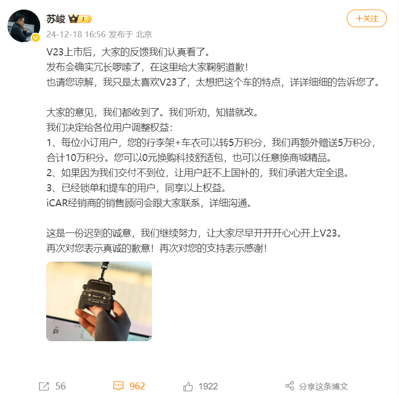 面對市場的強烈反響,蘇峻雖迅速在社交平台上道歉,並給出了積分補償的補救措施,但這一切似乎都未能挽回消費者的心。從目前的市場表現來看,iCAR V23的“慢熱長紅”之説,更像是一個遙不可及的夢想。