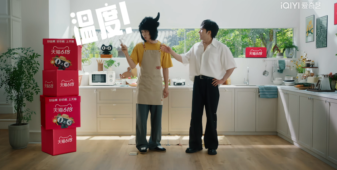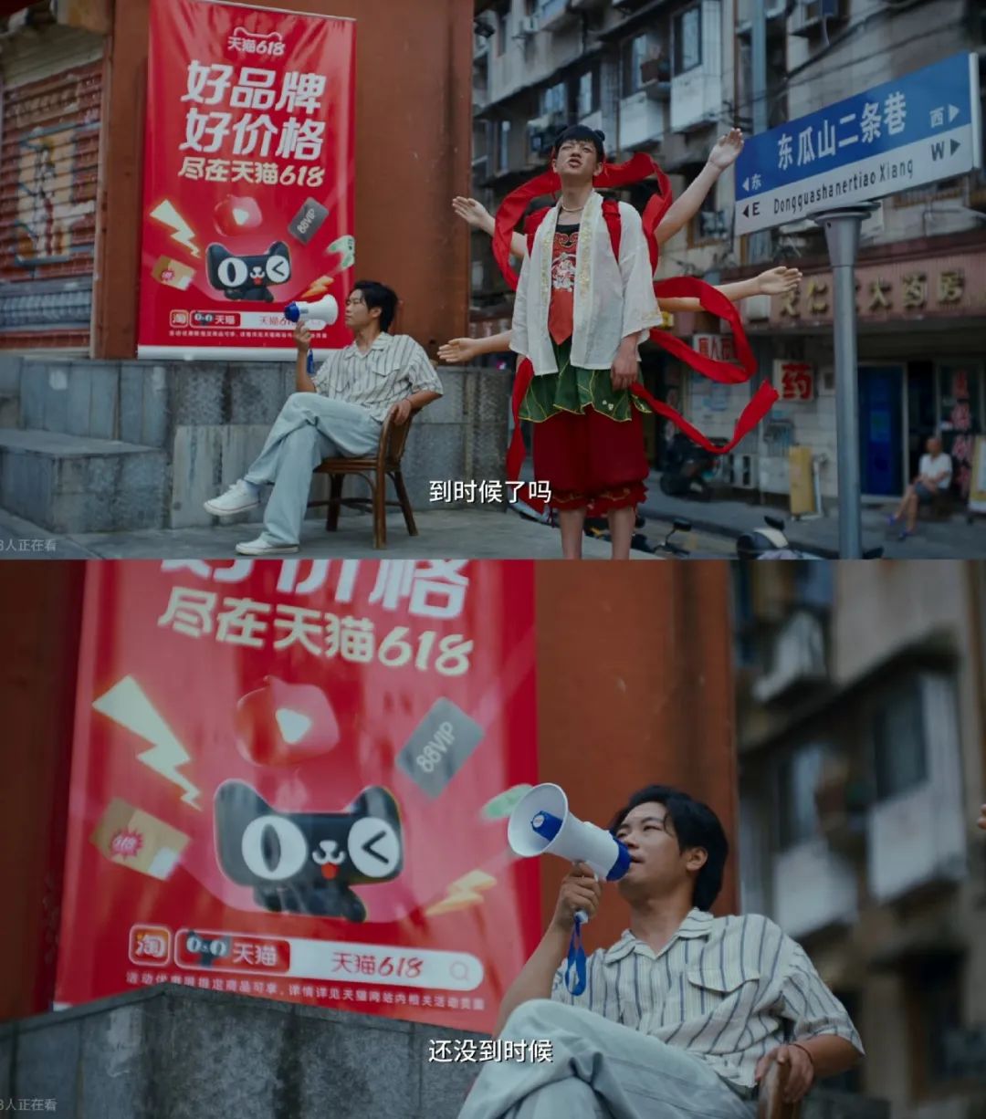 逢520節點,天貓與紅果短劇推出“心動劇場”,“天貓618搶先購字樣”,以及中插、跳轉等設置,也打通了跨平台引流渠道;6月12日,天貓總冠名的短劇《呀!神仙來了》在B站上線,由去年《脱口秀和Ta的朋友們》年度冠軍漫才兄弟主演,當第八集二人通過不斷重複的“到時候了嗎?”和“還沒到時候”對話引出前幾集劇情的閃回後,多個場景下天貓618活動海報的露出,以及最後説出的“等到618”等廣告語,天貓618廣告與短劇在這一刻完成了高度的融合,彈幕不斷閃過的“八集憋了個廣告是吧”、“為了碟醋包了頓餃子”等表達,在説明觀眾對於廣告的接受程度之外,也共同組成了這一短劇營銷的喜劇色彩……