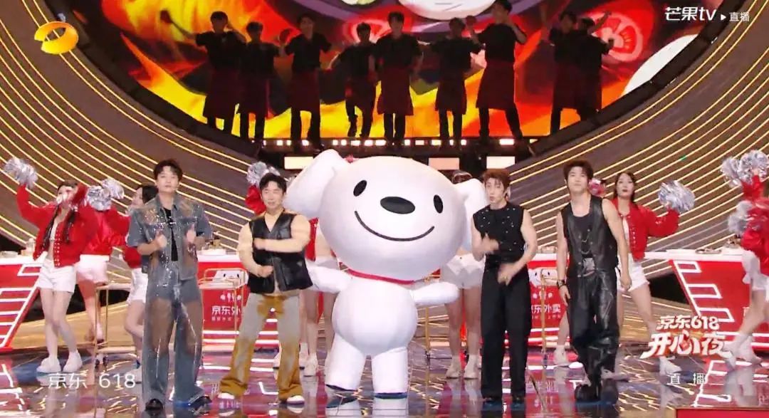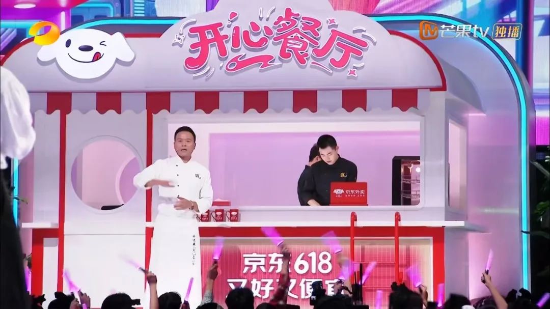 隨後重頭戲的6月17日,《京東618開心夜》正式在湖南衞視、芒果TV播出,剛剛結束的《乘風》成團的姐姐們、幾季《披荊斬棘》人氣頗高的哥哥們、兩季《歌手》話題度很高的歌手們等都出現在了晚會直播現場。晚會中不僅時不時以各大陣營遊戲比拼形式,為觀眾送上京東618福利,還打通了晚會現場與京東各大直播間的界限,讓觀眾可以一邊看晚會、一邊購物;同時晚會還邀請到《中餐廳》的林大廚現場限量製作中餐廳同款京東618套餐,為長沙的幸運觀眾“秒送”同款美食;甚至直接以一個《開心蛋炒飯》表演,將京東618、京東外賣等廣告和關鍵詞唱了出來。
