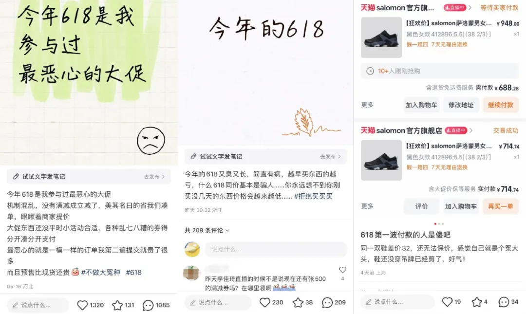 這也是今年618營銷的一個困局,所有的娛樂營銷目的都在告訴用户618正在進行了,但是卻在消息傳達之後,用更冗長的週期、更復雜的節點玩法讓用户迷失在“我到底何時買才便宜”的疑問裏,畢竟就拿長視頻的開屏推送來説,三個時間點之下,兩個平台在催促你下單,前腳買完,後腳來了,而社交媒體上充斥着“第二次比第一次便宜”“第二次也買虧了”等嘈雜之聲,消費者也就亂了。