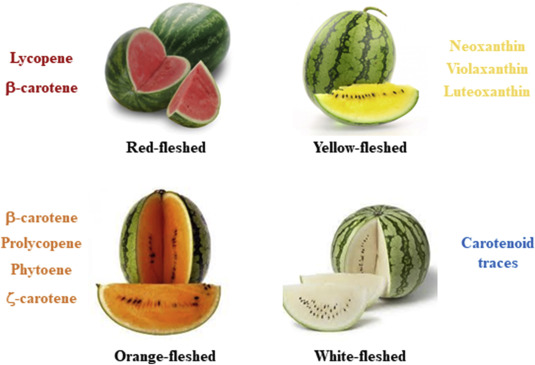 橙色西瓜富含β-胡蘿蔔素及其前體,如多順反式番茄紅素(prolycopene)。β-胡蘿蔔素可以在人體內轉化為維生素A。